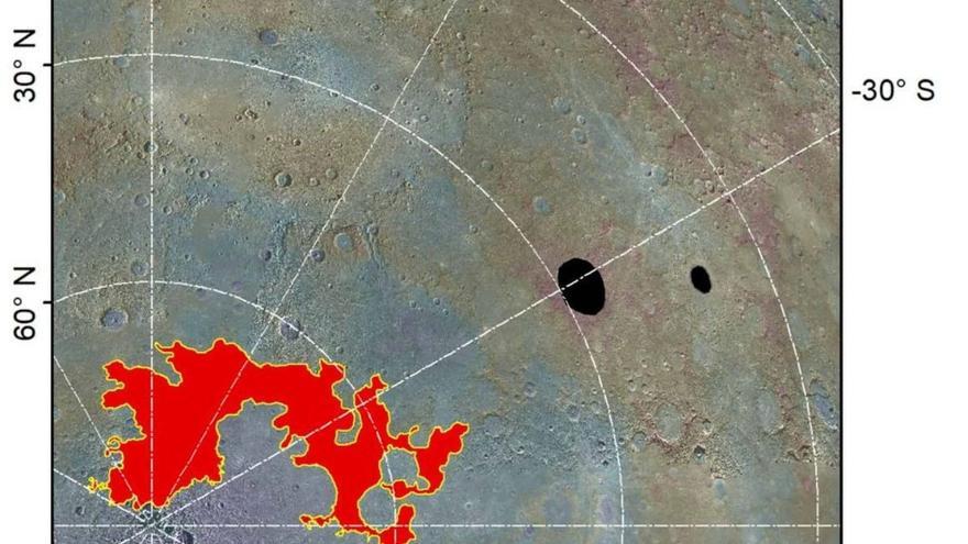 Una vista del terreno caótico del polo norte de Mercurio (Borealis Chaos) y los cráteres Raditladi y Eminescu, donde se han identificado evidencias de posibles glaciares de sal. / CRÉDITO: NASA.