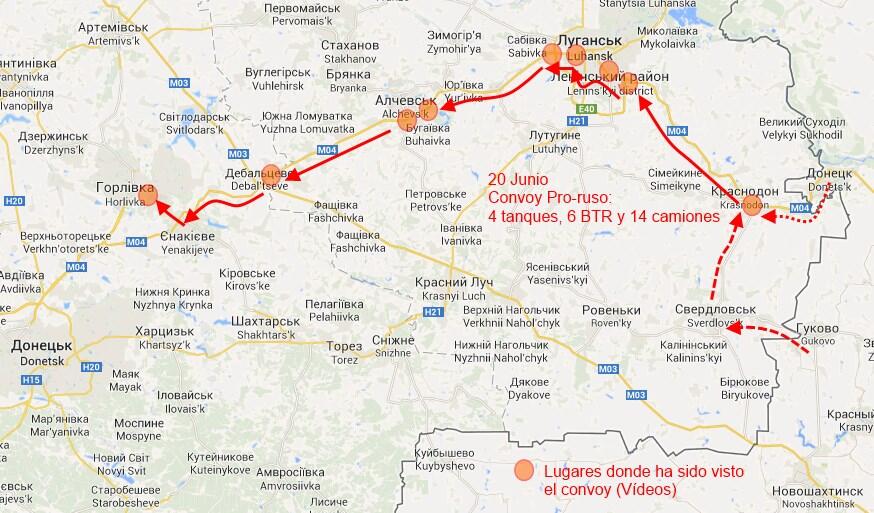 La ruta del convoy separatista del 20 de junio. Aunque en algunos vídeos no vimos la misma composición, creo que simplemente es porque no los tomaron enteros cuando el convoy pasaba y creo que la composición de la columna separatista ha sido de 4 tanques/carros, 6 BTR y 14 camiones, más algún pequeño vehículo de apoyo.