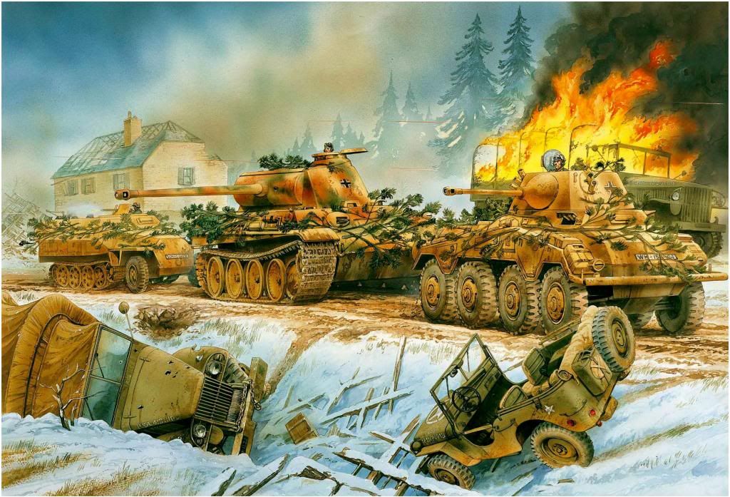 Carrera del Kampfgruppe Böhm hacia el Mosa en los días previos a la Navidad de 1944. Este grupo de batalla estaba basado en el Batallón de reconocimiento de 2ª Panzerdivision, Panzer Aufklärungs Abteilung 2, pero su poder de combate era reforzada por algunos tanques Panther del 3er Regimiento Panzer (Pz.Rgt.3). Esto era necesario ya que su batallón de reconocimiento había sido reequipado sólo parcialmente antes de la operación Ardenas. Su Primera compañia estaba ausente por encontrarse reequipandose, mientras su mientras que su tercera compañia estaba equipada principalmente con bicicletas. mal equipados o no, una de las razones para el éxito de la 5º Ejército Panzer penetrando profundamente detrás de las líneas americanas fue el uso efectivo de sus unidades de reconocimiento. el Cuartel General del Grupo de Ejercitos B de Model fue crítico por la mala utilización de unidades de reconocimiento por parte de las Waffen-SS Panzer-divisiones, que por lo general los empleaban como cualquier otro formación Panzer o de Panzergrenadier. Las Panzerdivision del ejército regular habían aprendido por experiencia que el trabajo principal de los elementos de reconocimiento era moverse rápido y evitar el combate innecesario afin de cumplir con su misión. La patrulla blindada que se ve aquí es dirigida por un vehiculo blindado Sd.Kfz. 234 Puma. Este fue uno de los más eficaces vehículos de exploracion de la Segunda Guerra Mundial, armados con una cañon de 50 mm. Cada una de sus ocho ruedas tenia muelles de forma independiente y contaba con una excelente movilidad todoterreno para un vehículo de ruedas y una alta velocidad de desplazamiento de más de 50 kilómetros por hora en carretera. En las Ardenas, la División tuvo diez de estos vehículos blindados así como dos 234/1 armados con un cañon de 20mm y dos Sd.Kfz. 233 armado con un cañon corto de 75mm. Siguiendo al Puma va un Panther Ausf. G. La 2ª Panzerdivision comenzó la ofensiva con 51 Panther y 29 Panzer IV. Detrás de la panther esta un semioruga Sd.Kfz. 251. Aunque más comúnmente asociados con los regimiento Panzergrenadier, También fue utilizado por unidades de exploracion y había 13 de estos a la mano al comienzo de la ofensiva. El semioruga blindado de uso más común en el batallón de reconocimiento fue el semioruga Sd.Kfz. 250 con 33 unidades en servicio en diciembre de 1944. Los vehículos vistos aquí carecen en su mayoría de cualquier distintivo y/o insignia de unidad táctica desde que la División fue re-equipada apresuradamente antes del inicio de la ofensiva. El Panthert y el Puma carecen de los habituales numeros tácticos de la torreta y el emblema delTtridente (distintivo de la división) no se ve. El uso de follaje como camuflaje era común en las Ardenas, especialmente después del 23 de diciembre, cuando el cielo despejado marcó el regreso de los temidos Jabos americanos.