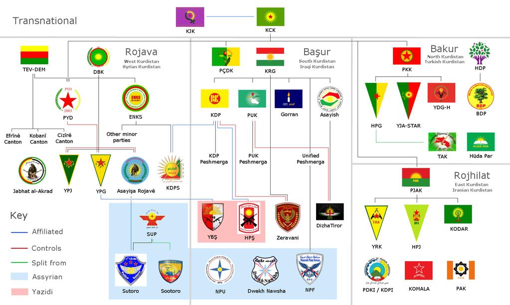 Partidos y milicias de las cuatro regiones kurdas (incluye los yazidíes y los asirios):