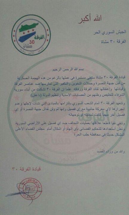 También en otras noticias, las División 30 del FSA (que había sido entrenada por EEUU y capturada por JN), emitió un comunicado diciendo que Al-Nusra no son sus enemigos, si no que únicamente lo son el régimen y el ISIS.