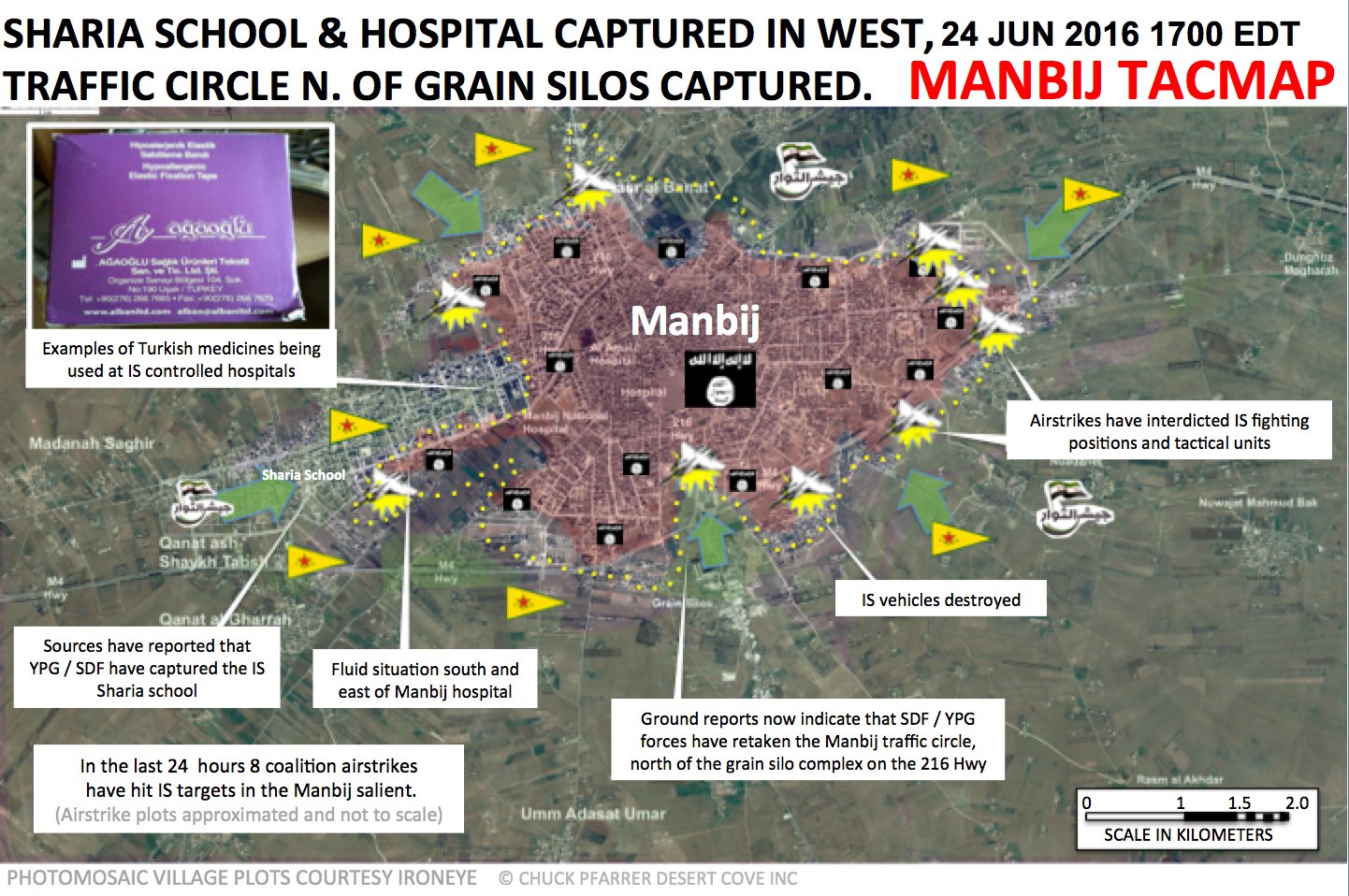 Ayer entraron en Manbij y hay combates en los silos.Próximamente este tío actualizará su mapa a principios de Julio.