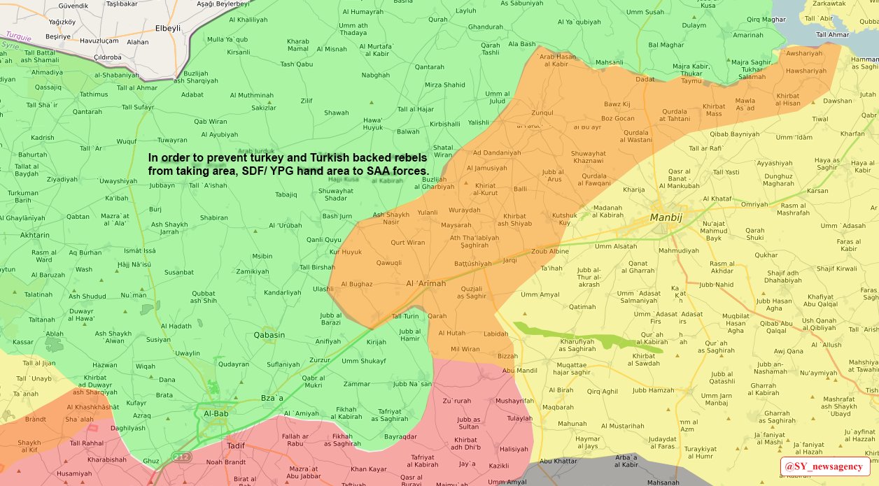Saludos a todos .. Los rebeldes capturaron 2 villas cerca de Arima , parece que 7 o 12 miembros del SDF perdieron la vida y unos 7 o 8 rebeldes , si los rebeldes logran tomar Arima estarian habriendo las puertas a Manbij , los grupos rebeldes estan concentrando una fuerza importante segun activistas en Azaz serian de 800 a 900 rebeldes los que estarian preparandose para atacar el area de Arima sin contar el apoyo Turcos ...
