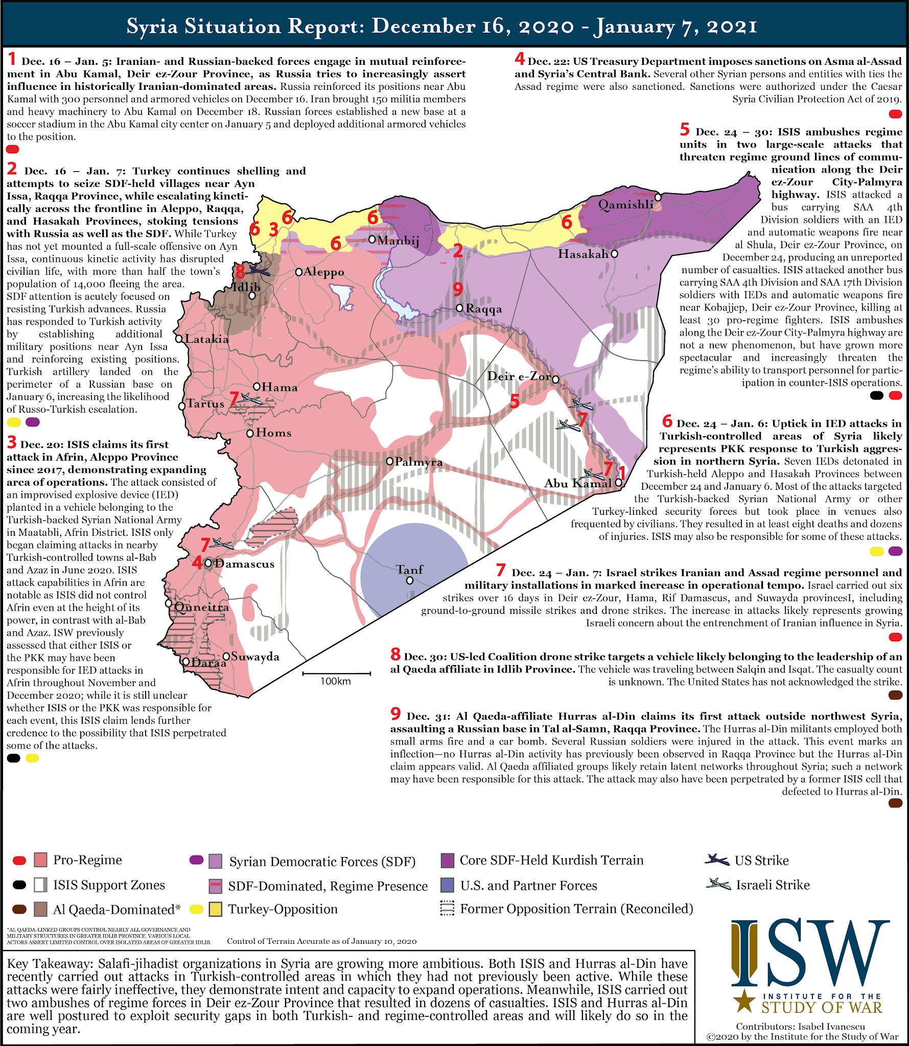 Resumen de la situación en Siria durante las últimas semanas. A destacar el incremento y expansión de la actividad del Estado Islámico y el primer atentado fuera de Idlib de la filial de Al Qaeda en Siria, Hurras al-Din. Este atentado se realizó el 31 de diciembre de 2020 en la provincia de Raqa y tuvo como objetivo a las tropas rusas.