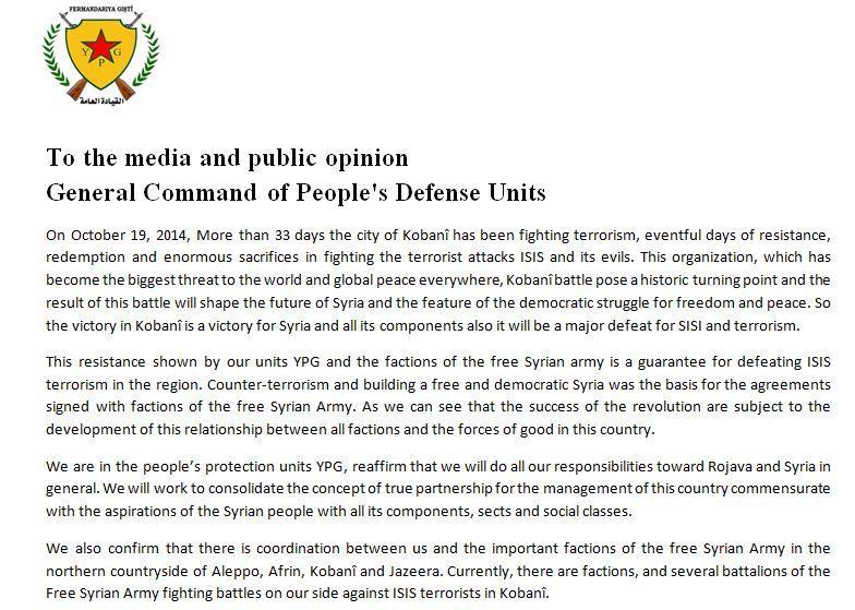 Por ese lado, el YPG confirma oficialmente la coordinación con el ELS (o sus "facciones importantes") en todos los frentes donde combaten: Efrin, Alepo, Kobane y Jazeera (Hasaka-Qamishli) y la presencia el ELS en la ciudad de Kobane: