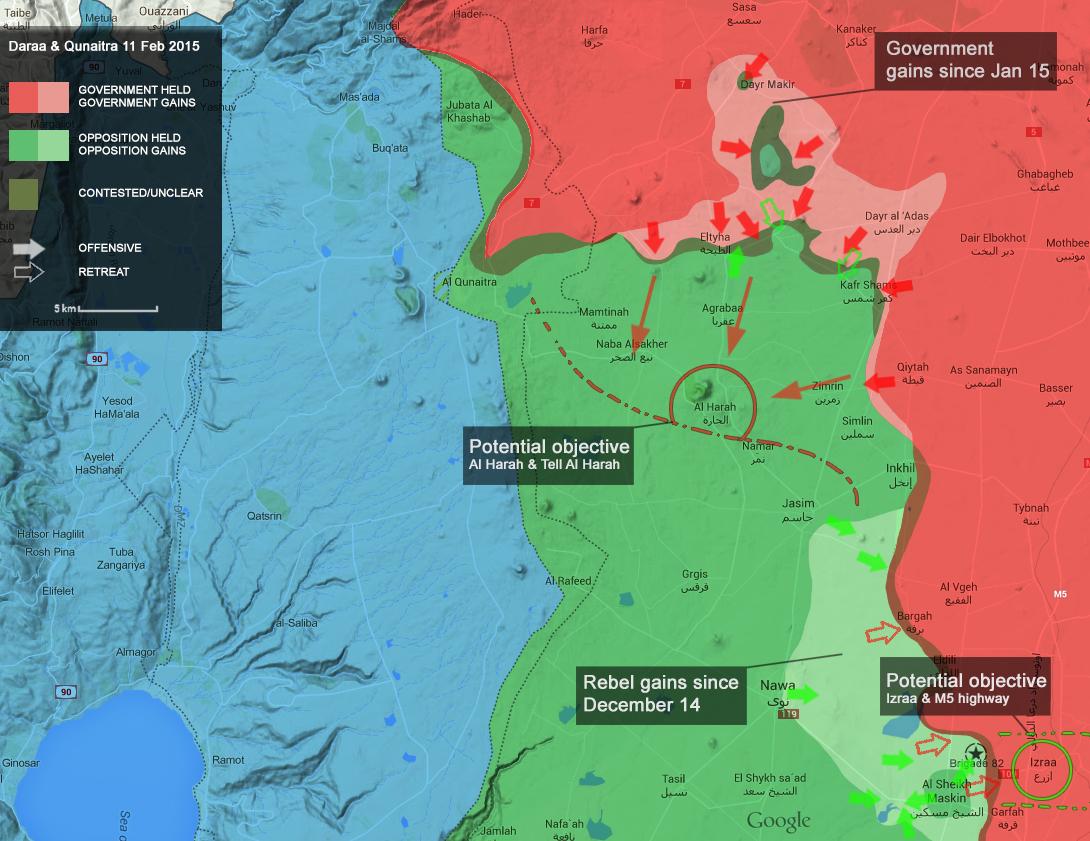 El ejercito sirio ha lanzado una ofensiva en Daraa que parece que ha tenido exito en algunas ciudades ha recuperado Deir Addas que la había perdido en Septiembre, Ayn Afa lo mismo, AT Tayha y Mashara también hay combates en Tall Antar el objetivo claro es Karf Shams.