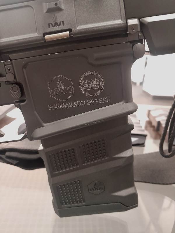 Detalle de uno de los ARAD 7 de 7,62 x 51 mm. salido de la Linea de Ensamblaje de FAME SAC. Se observa los logos de IWI y FAME SAC, y la inscripción “ensamblado en Peru”.