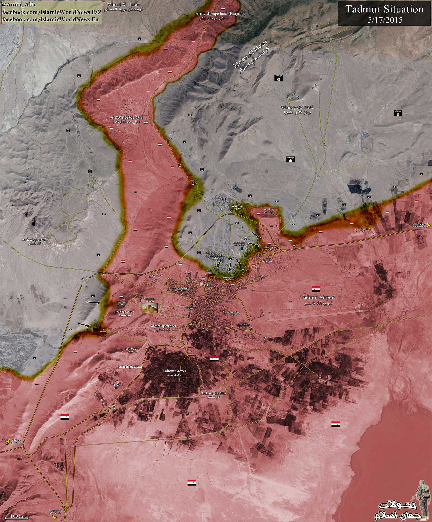 Y sobre Tadmur, según el Observatorio Sirio los ISIS controlan la Torre de Radio al oeste, el norte de la ciudad, y sectores del sureste (hay un fuerte combate dentro de la ciudad en estos momentos por la zona de la cárcel). Además que se han hecho con varias posiciones en torno al camino de Tadmur a Al-Sukhna, entre ellos varios campos de gas (Arak, Naijib, Al Hail, estación de bombeo T3), así que una gran motivación para ésta ofensiva seguramente fue el hacerse con el gas de Siria que estaba en poder de Assad.