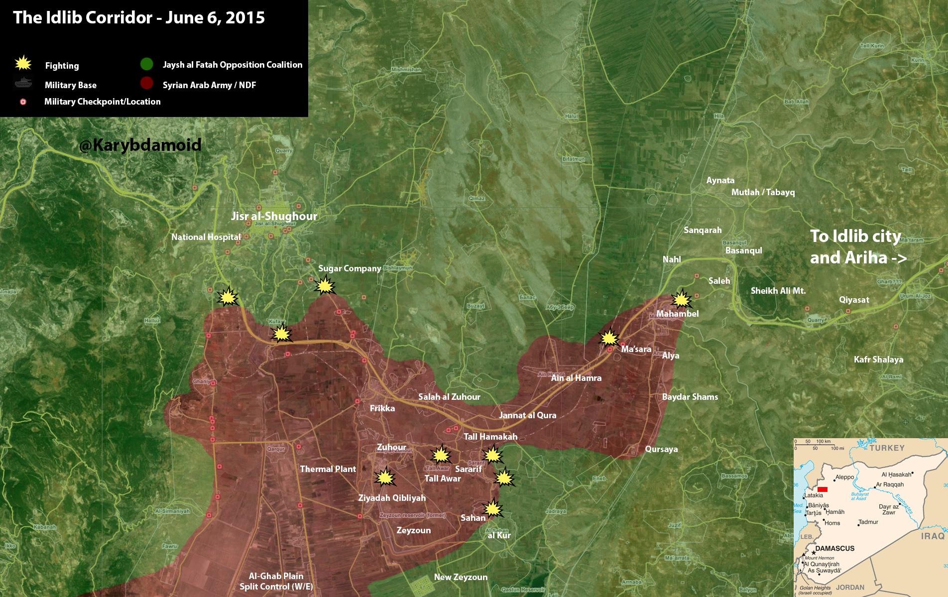 Los rebeldes siguen acortando el corredor de Idlib, ésta vez tomaron Nahl, Saleh, Basanqui, Sanqarah, Al Qisayat y ya están a unos cuantos kilometros de Frikka, sin embargo, también se puede apreciar la ofensiva de hace algunos días atrás del régimen haciendose con algunas posiciones alrededor de Frikka y ensanchano aquella zona.
